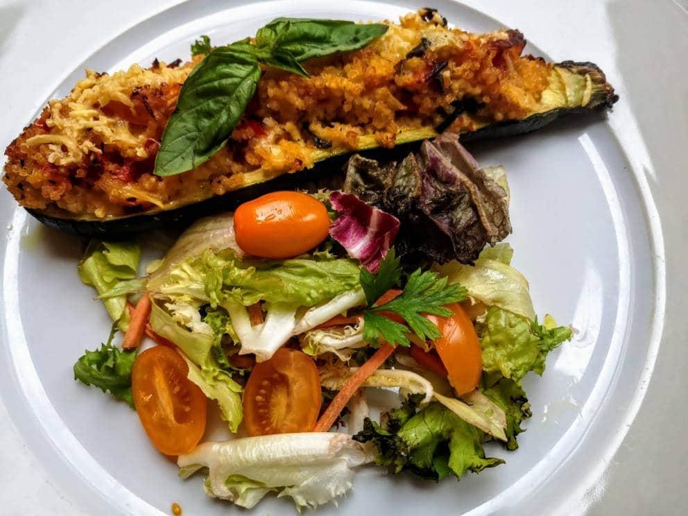 Bazsalikomos zöldséges kölessel töltött cukkini